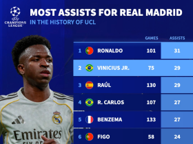 德转统计皇马队史欧冠助攻榜:C罗31次第1,维尼修斯29次第2