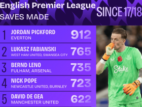 英超自17-18赛季以来门将扑救榜:皮克福德第1,德赫亚上榜