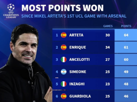 自执教阿森纳欧冠首秀以来,阿尔特塔欧冠拿分所有主帅第一