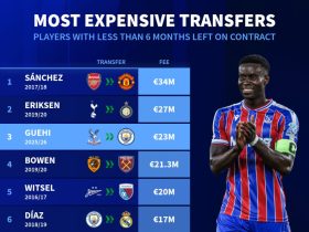 德转列合同剩半年球员转会身价榜:桑切斯3400万第1,格伊第3