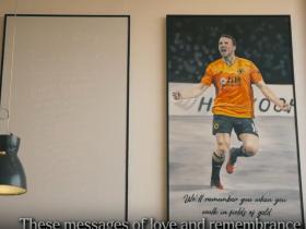 狼队展出纪念若塔的画作,据悉颜料由球迷悼念若塔的花朵中提取