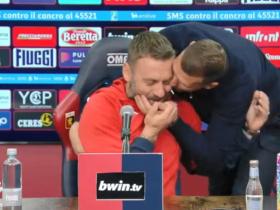 “罗马队友基情互动”,德罗西赛后新闻发布会被哲科亲吻