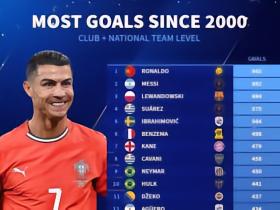2000年以来俱乐部&国家队进球总数榜:C罗945球居首,梅西第二