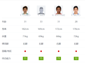 FIFA22中J联赛四大海归前场球员的能力值如下...