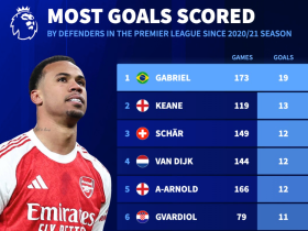 20-21赛季以来英超后卫进球榜:加布里埃尔19球第1,范戴克第3