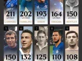 切尔西晒队史射手榜TOP10:兰帕德第1,德罗巴第4,阿扎尔第8