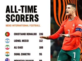 国家队历史射手榜:C罗141球居首,梅西114球第二