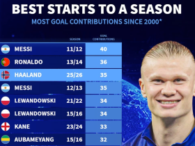 哈兰德本赛季至今直接参与35球,本世纪所有球员赛季同期第3