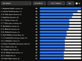 本赛季七大联赛关键传球排行榜:萨拉赫榜首,亚马尔、奥利塞在列