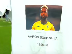 悼念国家队队友,加蓬国脚勒米纳展示印有布彭扎照片的T恤