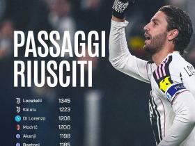 本赛季至今意甲成功传球榜:洛卡特利第1,莫德里奇第4