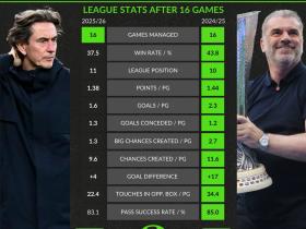 帅位稳吗?弗兰克前16轮胜率、进球等数据均不如上赛季的澳波