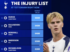 德转列热刺伤病名单:8人因伤缺阵,总身价超过2.5亿欧元