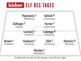 踢球者德甲第15轮最佳阵:斯塔尼希奇、聚勒、希克等球员在列