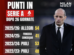 米兰本赛季意甲前26轮拿到54分,为近8个赛季同期第二高积分
