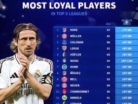 现役五大联赛效力同一支球队时间排行榜:科克、穆勒居首