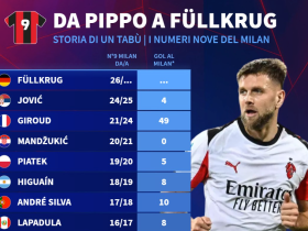 德转列因扎吉至今米兰历任9号进球数:仅吉鲁一人打进超过10球