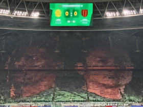 国安对阵成都赛前,工体展示张玉宁、法比奥双面巨型Tifo