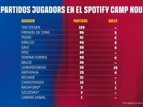 巴萨现役球员诺坎普出场榜:特狮居首,德容第二佩德里第三