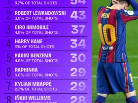 17-18赛季起五大联赛中柱数:梅西54次断层领先,莱万43次第二