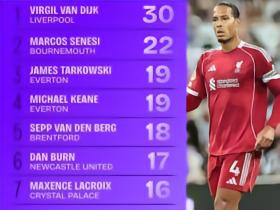 英超解围榜:范戴克30次断层领先,塞内西22次列第二