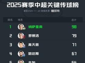 2025中超关键传球榜:纳萨里奥居首,本土球员高天意最多