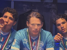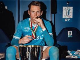 意超杯夺冠后,麦克托米奈和队友在更衣室里抽雪茄庆祝
