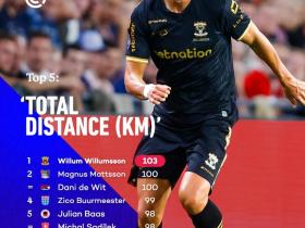 荷甲官方公布了截至目前为止联赛球员的跑动距离。其...