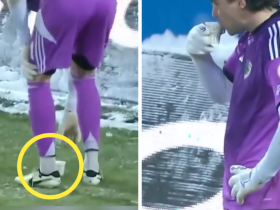 忒冷了,土甲门将在球门边放了杯热茶,比赛间隙喝茶取暖