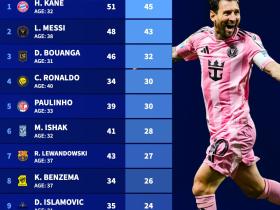 德转列本赛季30岁以上选手进球排行榜:凯恩领跑,...