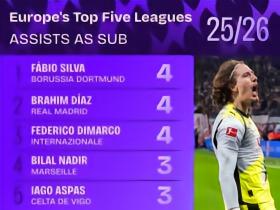 五大联赛替补助攻榜:法比奥-席尔瓦、卜拉欣、迪马尔科均4次