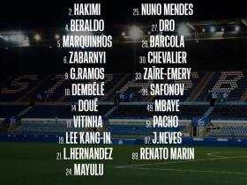 巴黎战里尔大名单:登贝莱、维蒂尼亚领衔,若昂-内维斯伤缺