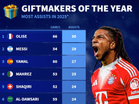 德转列2025年俱乐部+国家队助攻榜:奥利塞、梅西、亚马尔前3