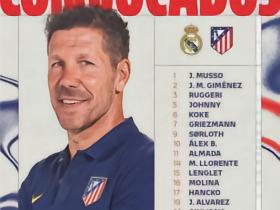 马竞客战皇马大名单:格子、科克领衔,普维尔、巴里奥斯缺阵