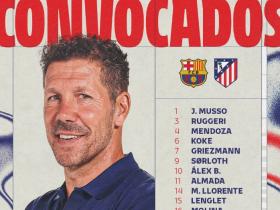 马竞战巴萨大名单:奥布拉克、略伦特缺席,多名青训小将入选
