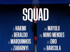 巴黎客战尼斯大名单:阿什拉夫、巴尔科拉、若昂-内维斯缺阵