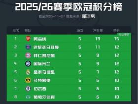 欧冠积分榜:阿森纳全胜领跑,巴黎、拜仁、国米、皇马均12分
