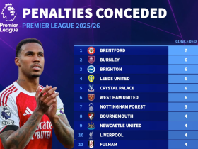 本赛季英超点球丢球榜:布伦特福德7球第1,阿森纳0球