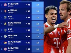 五大联赛开季13场历史10佳成绩:拜仁13战全胜+净胜38球第一