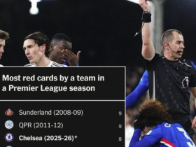已拿8红,切尔西剩余11轮英超若再拿一红即可追平赛会纪录