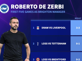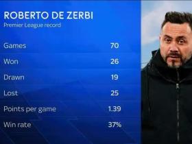 德泽尔比此前执教布莱顿在英超出战70场胜率仅37%,场均1.39分