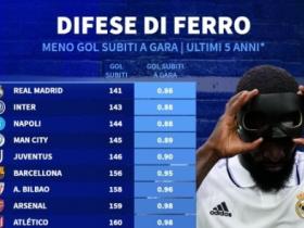 近5年五大联赛场均失球最少榜:皇马0.86球第1,国米0.88球第2