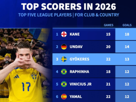 五大联赛球员2026年国家队+俱乐部进球榜:凯恩第1,哲凯第3