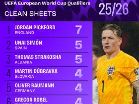 欧预赛门将零封榜:皮克福德7次第一、乌奈-西蒙5次第二