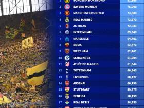 德转列2025欧洲俱乐部场均上座榜:多特居首,拜仁曼联分列二三