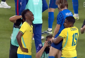 恩德里克赛后从背后抱起魔笛,后者笑容满面眼神里尽是宠溺