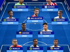 德转列南美最贵11人阵容:维尼修斯1.5亿领衔,巴西6人入选