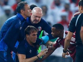 太疼了,卡塔尔主帅洛佩特吉在边线处被一球闷在脸上