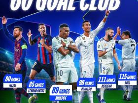 欧冠60球俱乐部:姆巴佩成为第6人,梅西80场速度最快