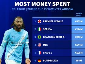 德转列2026年冬窗联赛支出榜:英超4.53亿欧断档第1,意甲第2